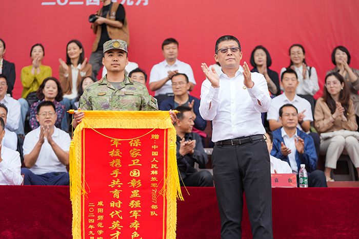 赵万东代表学校向承训部队赠送锦旗,诚挚表达学校对承训部队的敬意和感谢。