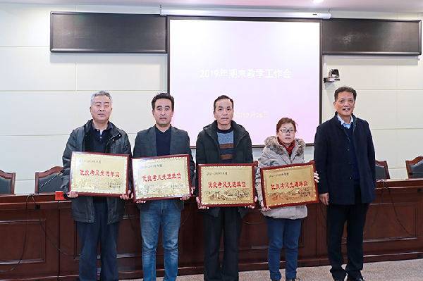 会议对2018-2019学年度优良考风先进单位进行了表彰,王长顺为获表彰的外国语学院、数学与信息科学学院、职业技术学院、物理与电子工程学院等四个学院颁发了奖牌和奖金。