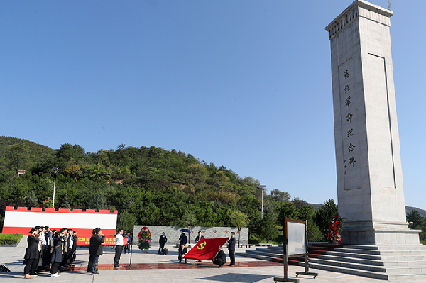 在马栏革命烈士纪念碑前,全体成员整齐列队,向革命烈士敬献花篮,面向鲜红的党旗、举起右拳,校党委书记赵万东领誓,重温入党誓词,表达守初心、担使命的决心和信念。