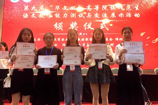 10月11日至14日,由中国教育技术协会微格教学专业委员会主办的“语文微格教学论坛暨第九届“华文杯”高等院校师范生语文教学能力测试活动(技能大赛)”在山东省潍坊市潍坊学院东校区隆重举行。由我校文学与传播学院傅美蓉、柯慧俐、王红三位教师指导的陈衍余、吉紫阳、吴佳妮、申津瑜、李凡等同学参加了比赛,并获得教学技能二等奖三项、三等奖两项;教学设计三等奖四项,优秀奖一项。